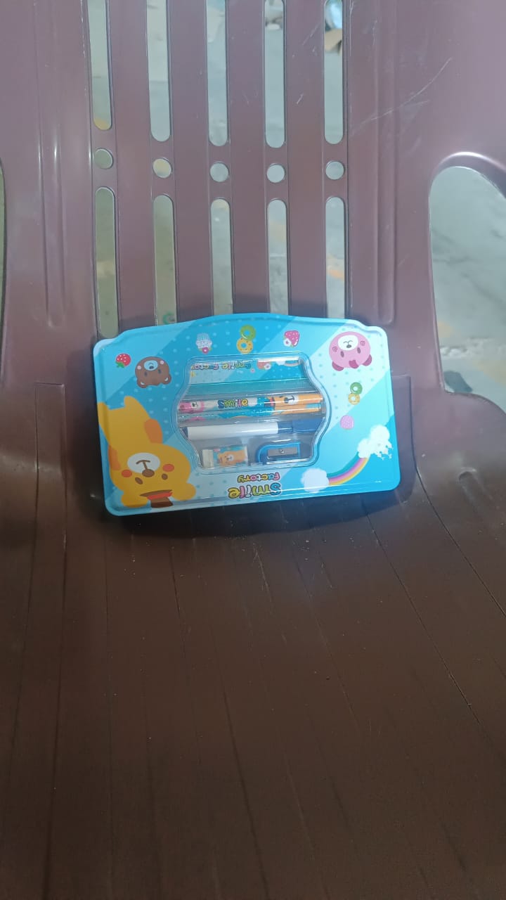 4137 Big Cartoon Printed Metal Compass Box, Pencil Case With Sharpner, Eraser, Pencil, Marker & Scale for Kids Stationery Compass Box, Stationery Gift for School Kids Compass, Pencil Box, Birthday Return Gift for Kids (6 Pc Set)